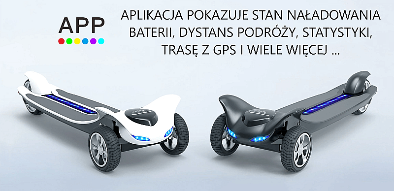 3 tryby prędkości (10 km/h, 18 km/h, 28 km/h), hamowanie; gwarantujący natychmiastową reakcję deskorolki i błyskawiczną reakcję na zadane polecenie;