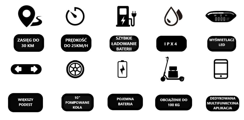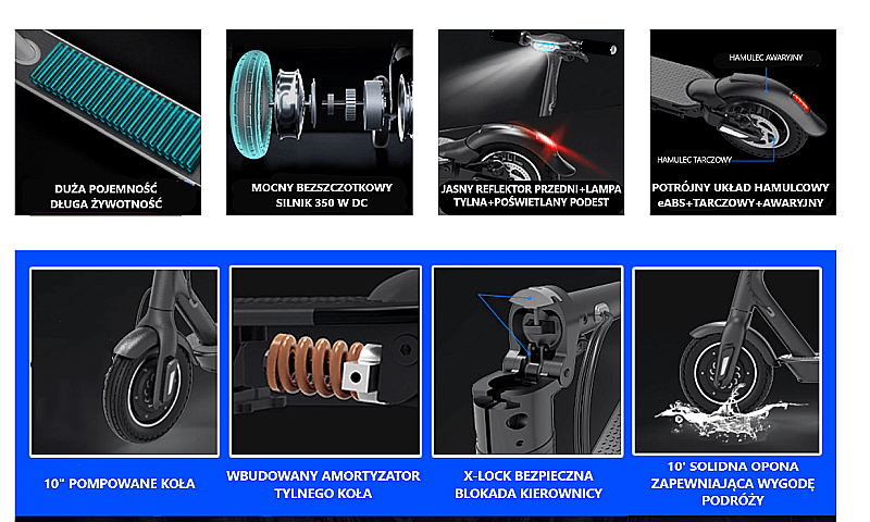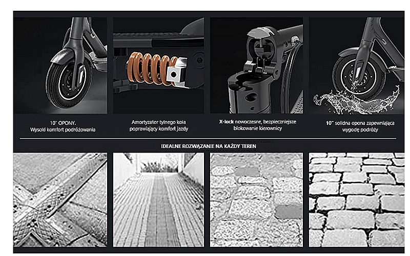 amortyzator: tylny schowany i zabezpieczony w podeście hulajnogi amortyzator, powoduje maksymalny komfort podczas jazdy;