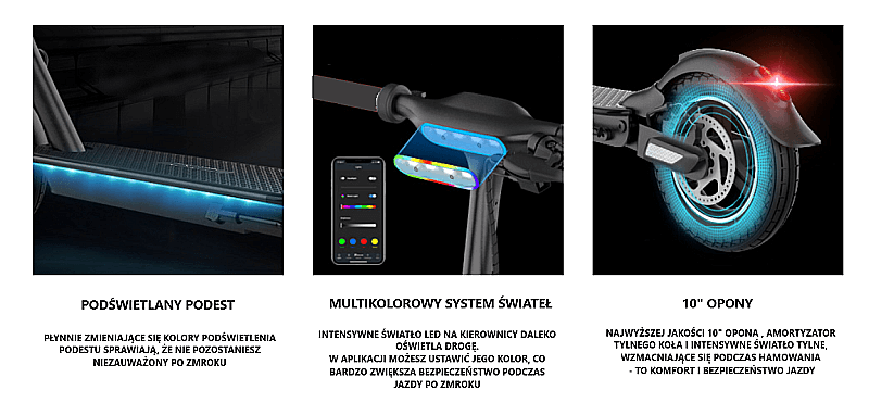 światła: przód, tył oraz spód hulajnogi podświetlenie LED z możliwością zmiany koloru za pomocą aplikacji;