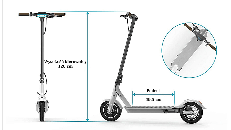 koła: pompowane, rozmiar 10 cali, zapewniają bardzo dobre parametry jezdne, szybkie i bezpieczne manewrowanie oraz odpowiednią przyczepność do podłoża;