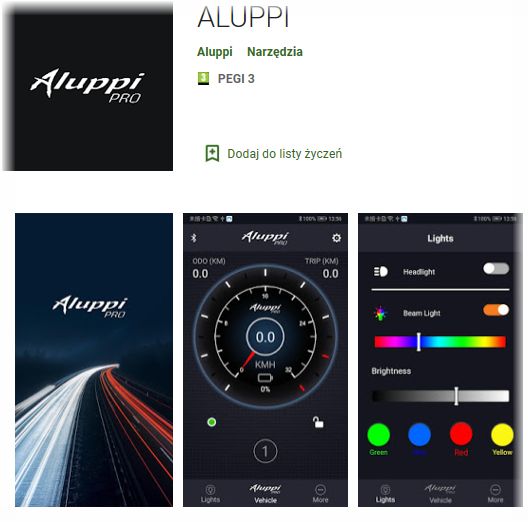 aplikacja: dedykowana dla Aluppi, rozbudowana, zapewniająca wiele przydatnych funkcji takich jak informacje techniczne, informacja o baterii, prędkość, zasięg, tryb pracy, biegi oraz informacja o położeniu na google maps, czas jazdy, przebieg, kolor podświetlenia, kontrola włączenia lampy przedniej, możliwość blokady antykradzieżowej oraz szereg dodatkowych funkcji, w tym ustawianie trybu jazdy, wykonywanie autotestu bezpieczeństwa czy uzyskanie wskazówek technicznych w aplikacji, bezprzewodowa aktualizacja; Połączenie telefonu następuje poprzez bluetooth, o czym informuje komunikat na wyświetlaczu hulajnogi. Przez aplikację w telefonie można zmieniać kolor i natężenie światła. Możliwość stworzenia profilu użytkownika i skonfigurowania funkcji dla rodzica (blokada maksymalnej prędkości). Możliwość wprowadzenie w tryb WALK nie ma wtedy konieczności pchania hulajnogi podczas spaceru, a hulajnoga jedzie dostosowując prędkość do idącego. Dodatkowo tryb ZERO STARTUP oraz NON ZERO STARTUP umożliwia ruszanie albo z odepchnięcia się nogą albo startuje od razu. To tylko część funkcji tej rozbudowanej aplikacji.